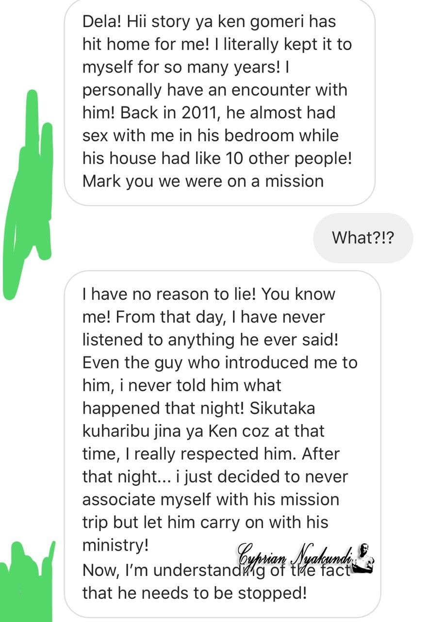 She told the blogger that during one of their mission trips in his house, Gomeri tried luring her into having sex with him, in his bedroom.