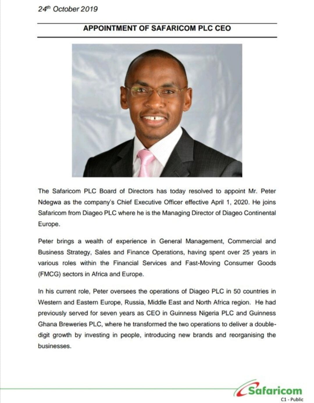 Diageo Continetal Europe Managing Director Peter Ndegwa (pictured) is the New Safaricom Chief Executive Officer (CEO). Mr. Ndegwa takes over from Michael Joseph who came in to head the giant Telco after the abrupt death of Bob Collymore in July 2019. We welcome the new CEO and wish he forever ends the crooked ways of