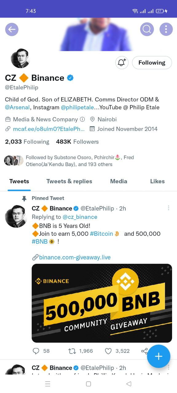 Philip Etale hacked: The scammers are posting messages to appear like it is Changpeng Zhao's account.
