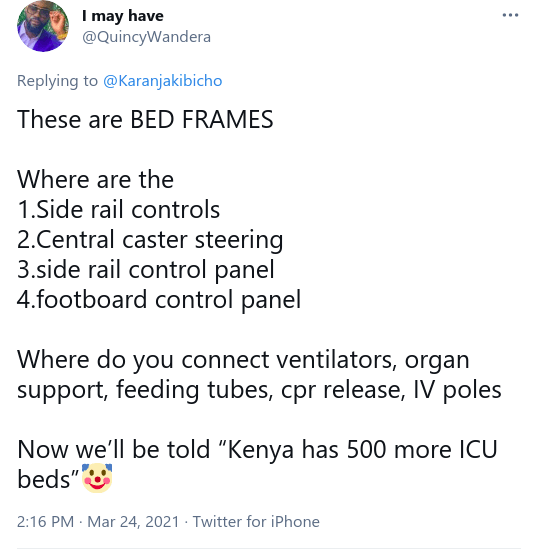 Netizens were, however quick to call out the mediocrity correct of the University of Cape Town graduate (where he acquired a Doctorate in Mechanical Engineering) that the structures he received from the young Kenyan innovators are not actually ICU beds but rather just ordinary, albeit uncomfortable hospital beds just like any other.