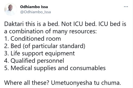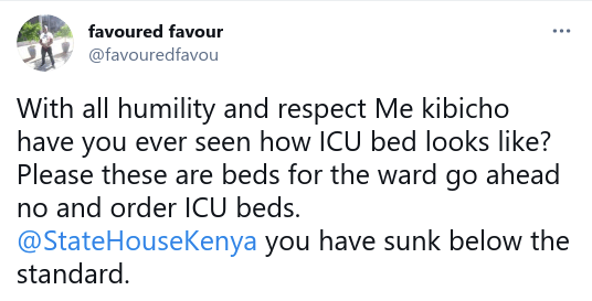 “With all humility and respect Me Kibicho have you ever seen how ICU bed looks like?” asked another.