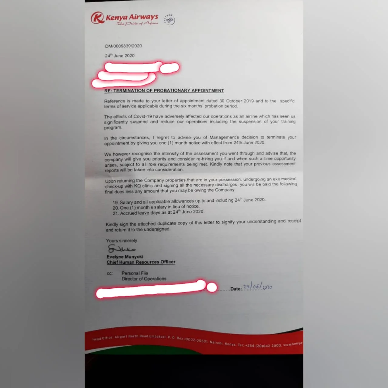 This is a letter that has been given to some KQ staff who were on contract. More letters to follow. It is alleged that some of those who will be affected are those who have worked for Kenya Airways under contract. Some of whom have worked for 5 years, 6 years, 7 years and even 8 years. They have been so loyal to the Company yet our management can’t see this. These people will be affected so much mentally owing to the fact that they have wasted all these years yet they will exit with nothing. Needless to say these are quite young people whom the Company can rely on and are much experienced. They get peanuts which means after the company will not save any money in the long run. Kindly check the below attached letter given to one of us.