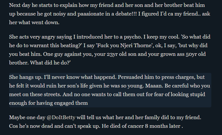 Maybe one day Ms Waitherero (@doitbetty) will tell us what she and her family did to my friend.