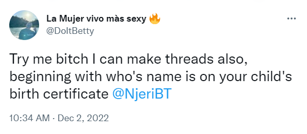 Adding: “Try me bitch I can make threads also, beginning with who’s name is on your child’s birth certificate.”