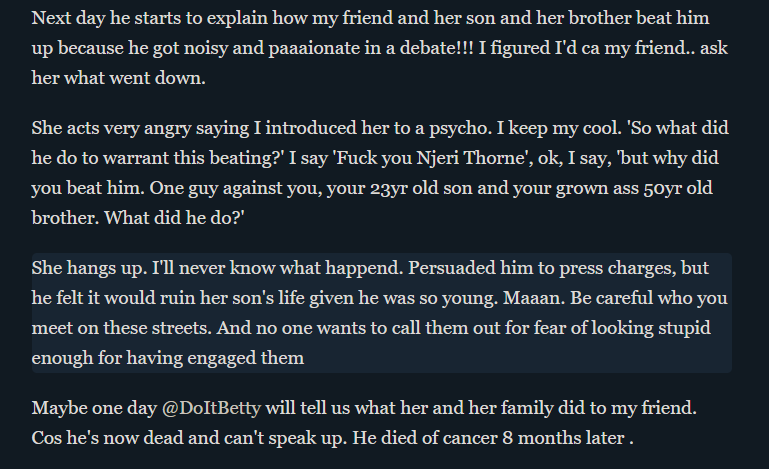 I keep my cool. ‘So what did he do to warrant this beating?’ She says ‘Fuck you Njeri Thorne’, ok, I say, ‘but why did you beat him. One guy against you, your 23yr old son, and your grown-ass 50yr old brother. What did he do?’