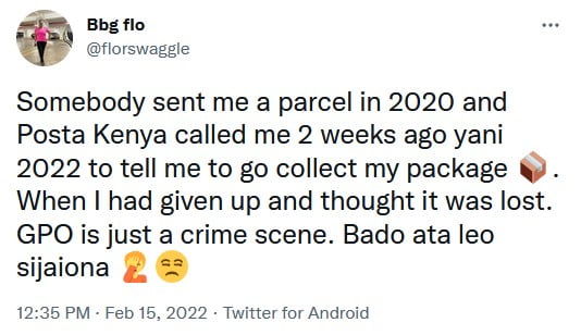 "Somebody sent me a parcel in 2020 and Posta Kenya called me 2 weeks ago to tell me to go collect my package when I had given up and thought it was lost," she wrote.In the last part of her tweet published during morning hours, Flora still expressed her lack of surety on whether the government corporation led by Daniel Kagwe would actually honour their pledge to deliver the package before the end of the day.