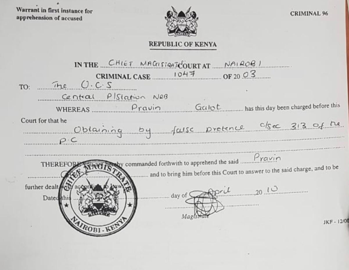 They asked the court to order the arrest of the three in order to be taken to court to take plea. In an the application supported by affidavit of Mohan Galot the applicants aver that Pravin Galot is not a director of the companies and that he is the one who engineered the removal of the registry file for Galot Industries Ltd from the companies registry with the assistance of one Hardy Bob Mose and Kaka Kamau, a former state counsel in the Attorney General's office.