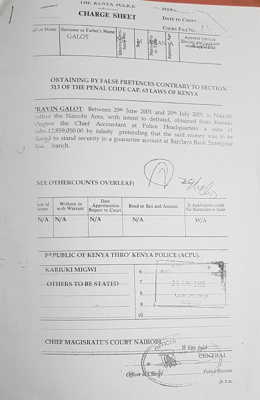 According to court papers he on 18th January 2002 with intent to defraud and without lawful authority made a false document namely; a notification of change of directors and secretaries of King Wollen Mills Limited Company purporting it to be a genuine document. Galot is accused of making a notification to the effect that Pravin Galot and Rajesh Galot who were directors of the company had resigned on 4th January 2001, a fact he knew to be false.