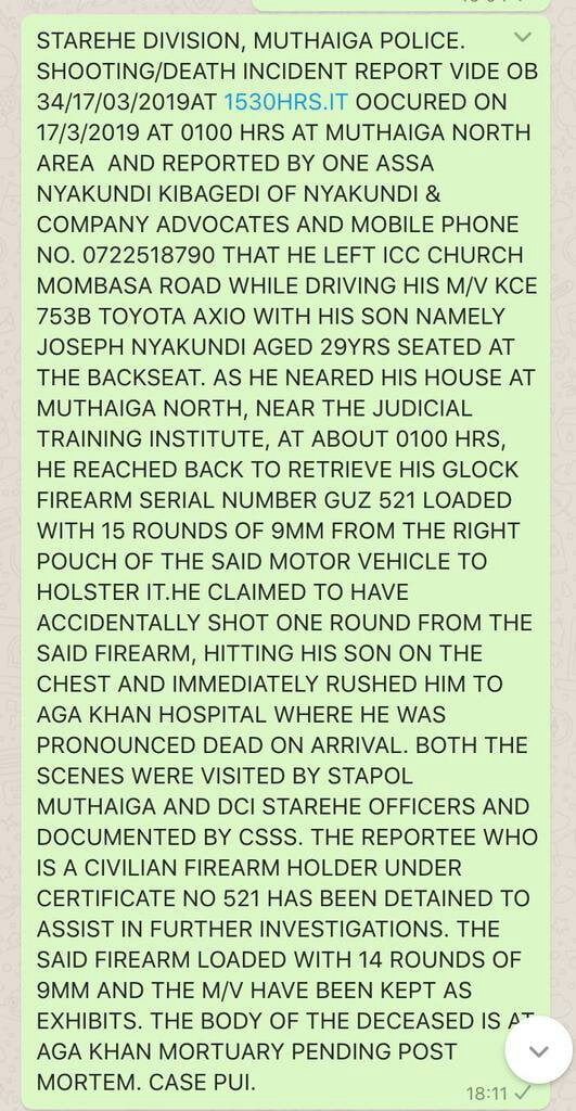 Lawyer Assa Nyakundi is being detained by police after he accidentally shot his son in the chest, this evening.