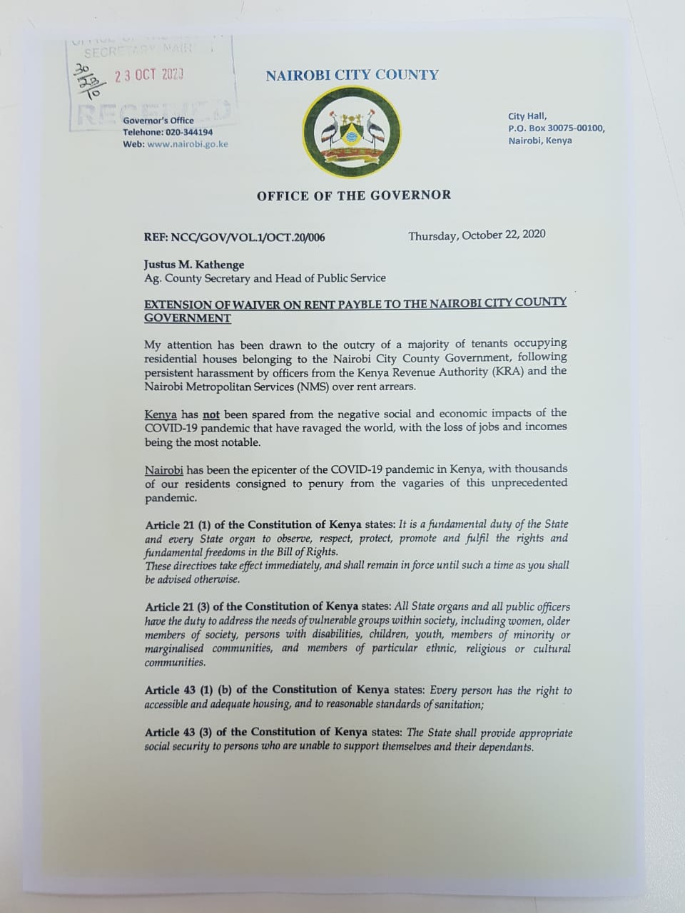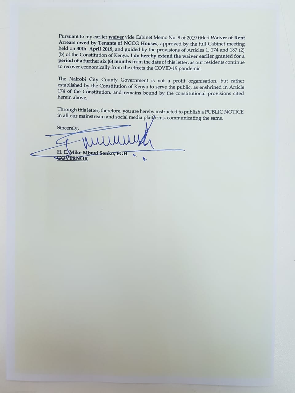 Sonko has extended the waiver on rent payable to the Nairobi City County for another six months to cushion the city residents from the negative economic impact.