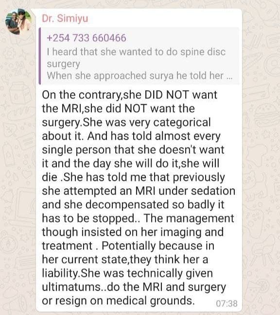 From a WhatsApp screenshot seen by nyakundireport.com, Mwenesi was categorical to everyone at the facility that she did not want to undergo MRI under sedation.