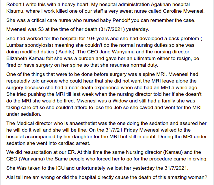 From a lengthy post circulating online, the facility’s administration is accused of influencing the death of one of its workers, a healthcare provider by the name of Caroline Mwenesi, who died while undergoing a medical procedure.