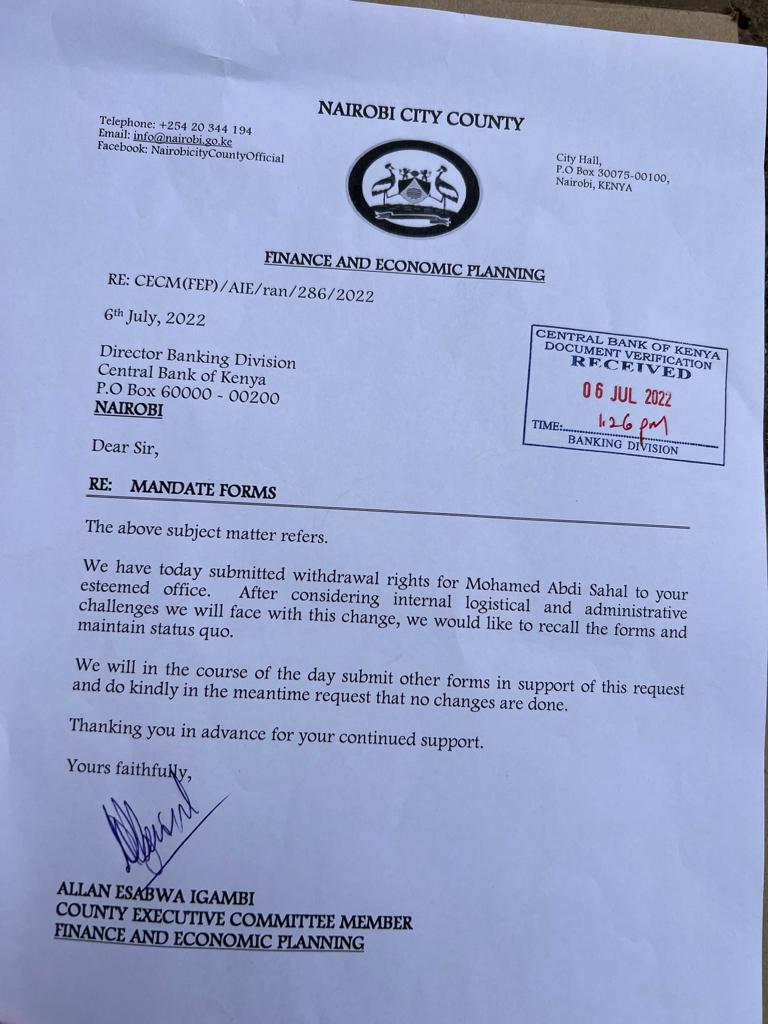 The move to rescind the transfer was announced by Allan Igambi who asked banks to retain his signature.