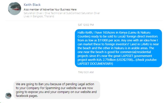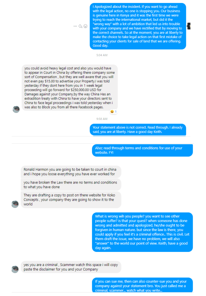 Let me be precise. I made a “mistake” of contacting Chinese Property Investors’ clients to make them aware of properties we have in Kenya for sale/ invest in. I never knew that would amount to a mistake. All I knew was that I was marketing my property listings.