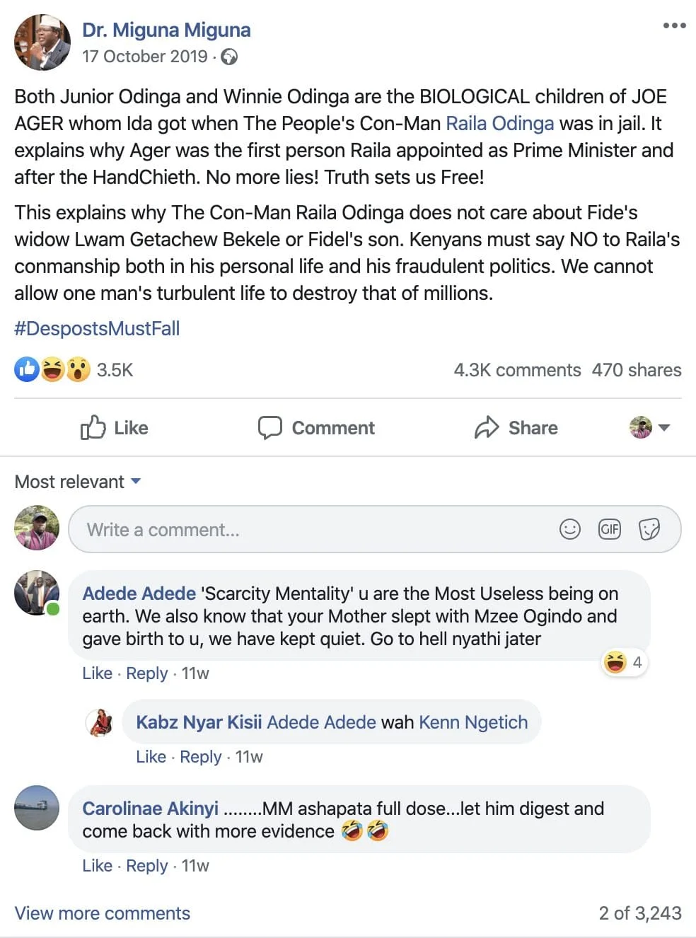 In the posts, Miguna alleges that the former Prime Minister is not the biological father of his two children – Fidel and Winnie – who he claims were conceived during the period “Baba”, as his supporters love to call him, was in prison.
