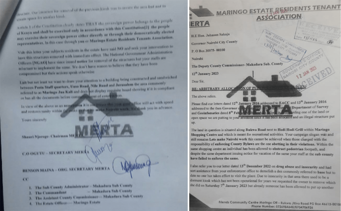 This comes a week after the Maringo Estate Residents Tenants Association (MERTA) also wrote a letter to Nairobi Governor Johnson Sakaja, lamenting over the same structures.