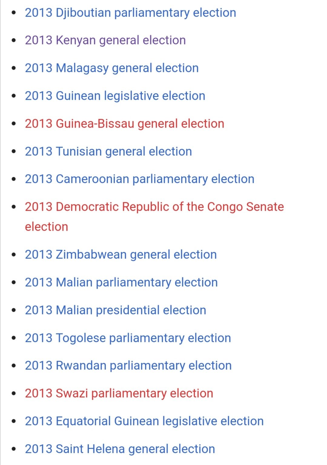Well noted. General elections took place on 4 March 2013. Other elections that took place in other parts of Africa in 2013 include Cameroonian parliamentary election, Djiboutian parliamentary election, Equatorial Guinean legislative election, Ethiopian presidential election . .