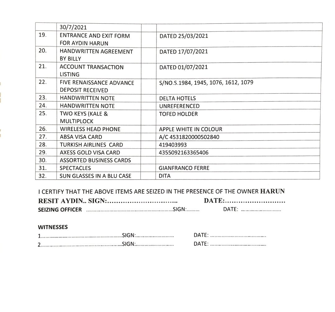 Hours after whisking Deputy President William Ruto’s Turkish associate Harun Aydin out of the country, the National Police Service (NPS) has released an official inventory of all the items they seized from the controversial businessman.