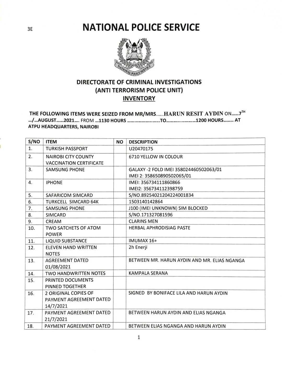 In the list which emerged on Monday night, the Directorate of Criminal Investigations (DCI) through the Anti-Terrorism Police Unit (ATPU) confiscated a total of 32 items from Harun Aydin.