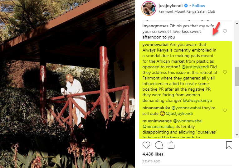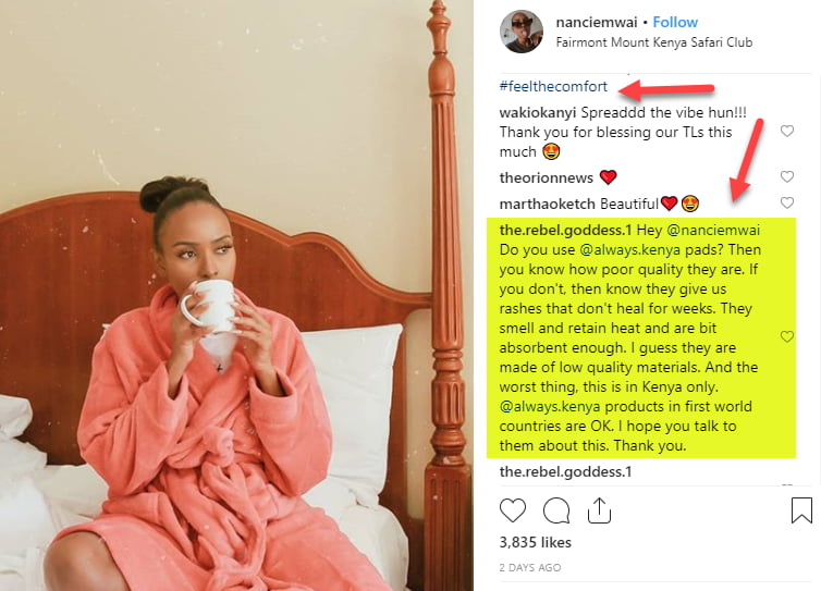 Instead of responding to their customers’ concerns, Always Kenya chose to treat their influencers to a weekend getaway at the Fairmont Mount Kenya Safari Club where they uploaded several photos with the hashtag #FeelTheComfort.