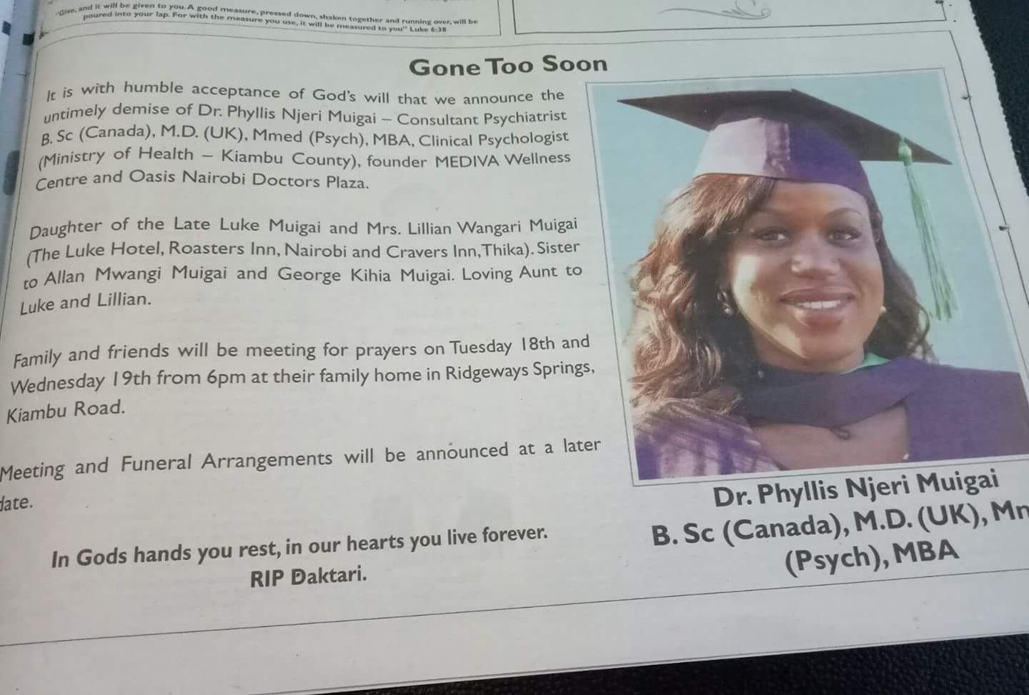 Some disturbing news of a brilliant cheerful young Kenyan doctor who passed on.