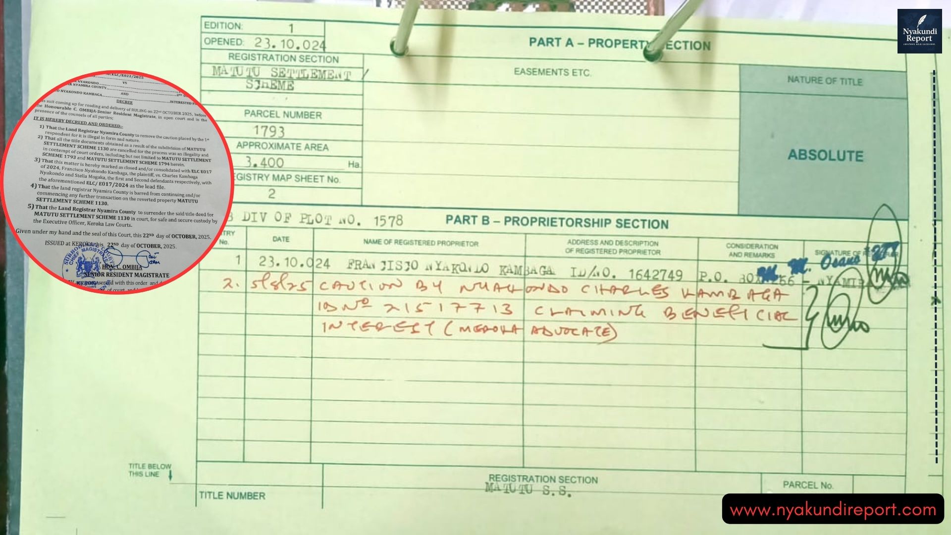 When the mother and sons went to Keroka law courts to lift the caution, they were shocked. The court declared the old man’s subdivisions illegal. It then ordered the land registrar to surrender the original title and cancel every subdivision already done. This ruling placed the entire family back to zero, and Kambaga used that opening to tighten his grip.