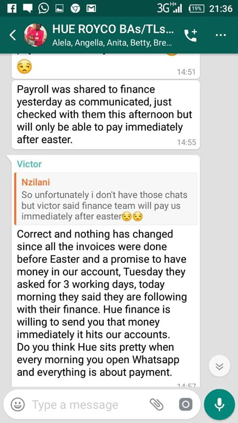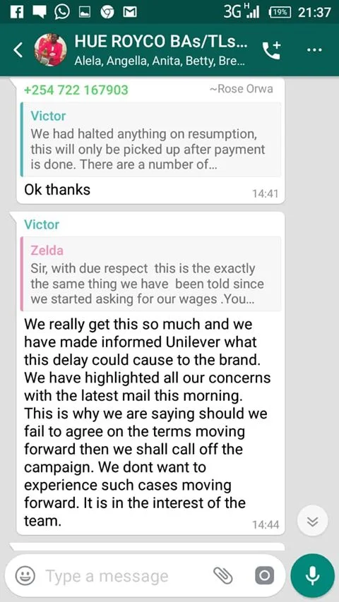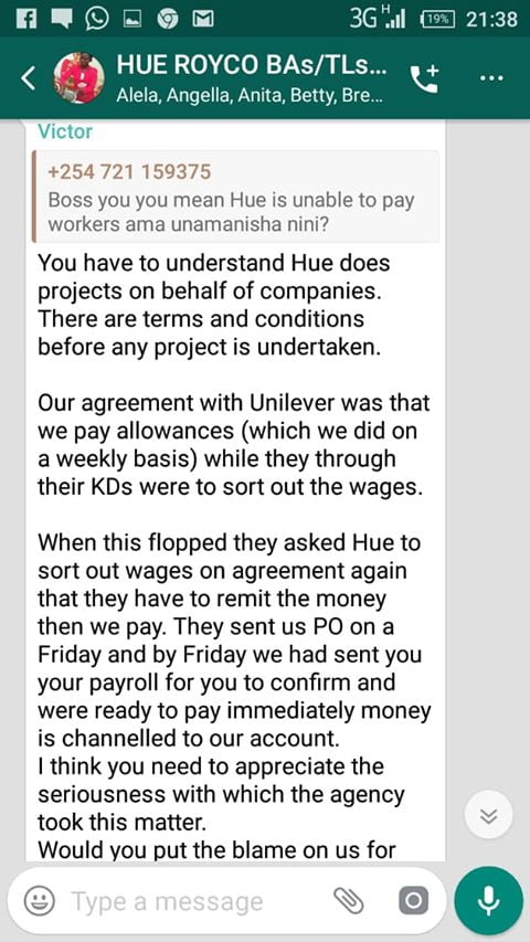 “Hello Cyprian, kindly help us deal with Unilever and Hue Experiential Marketing Agency. We worked for four months but we have never been paid.
