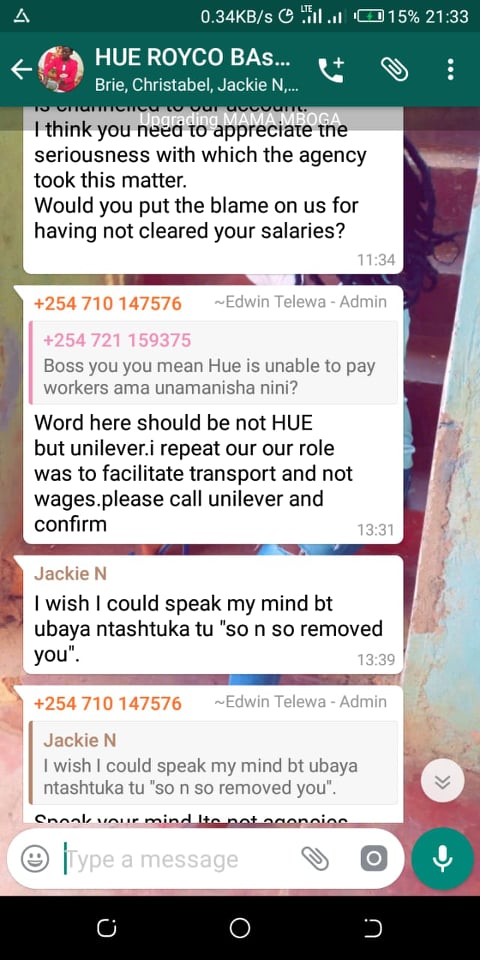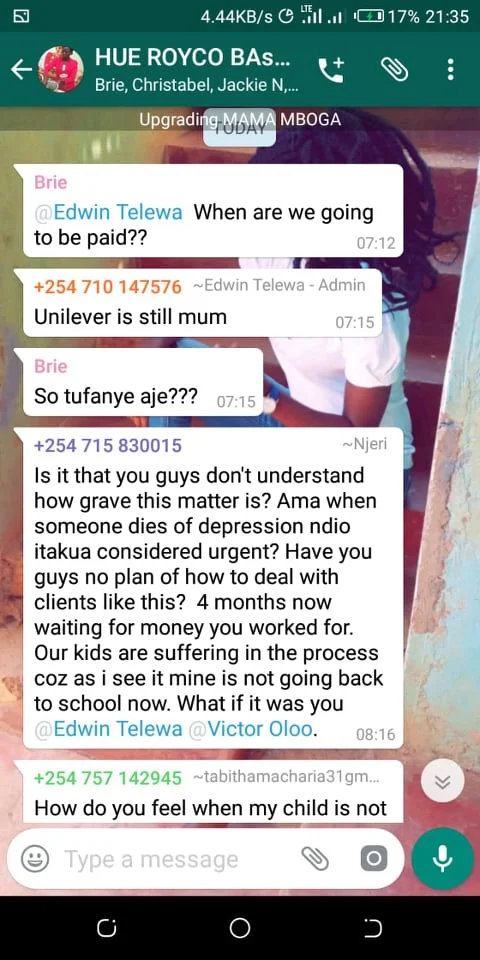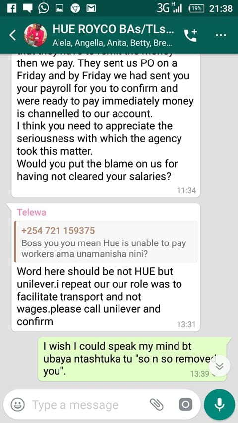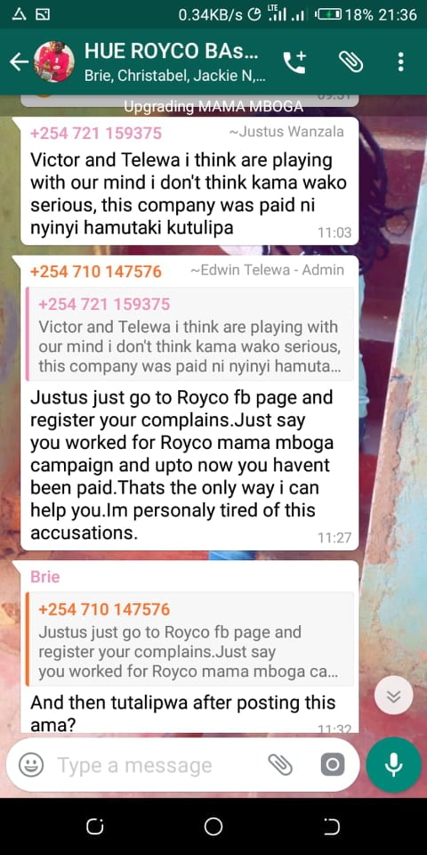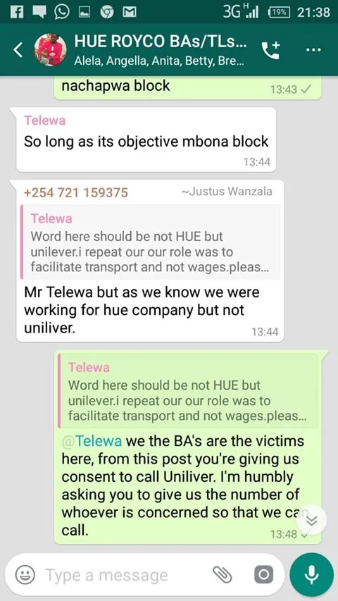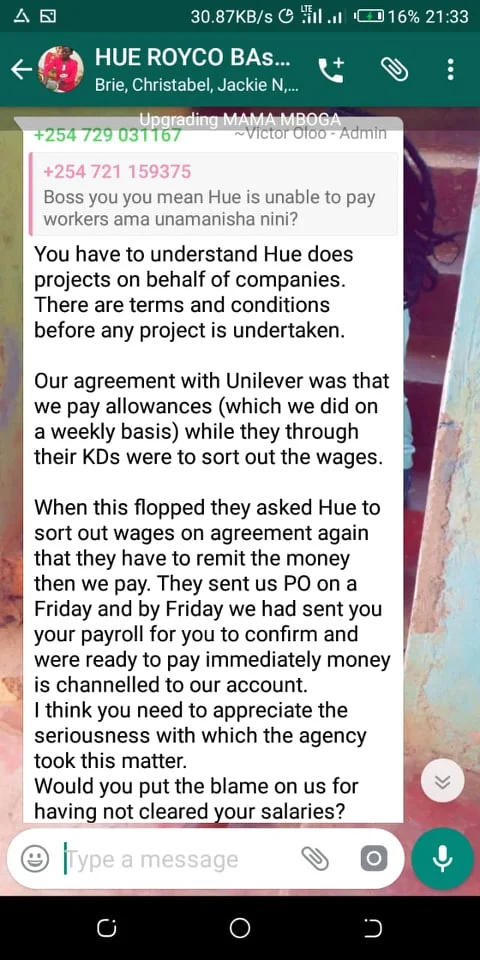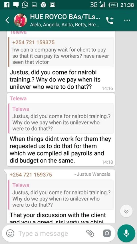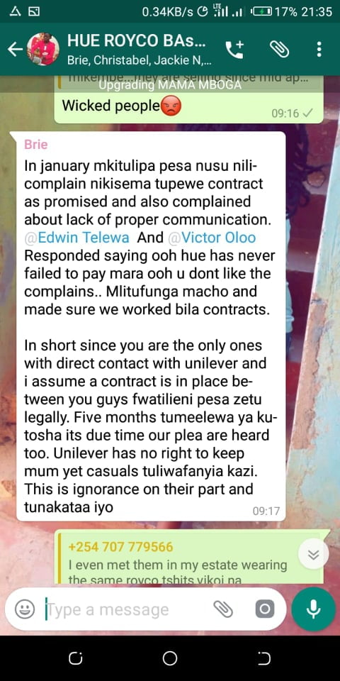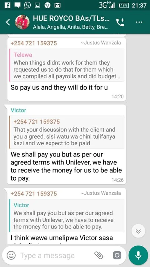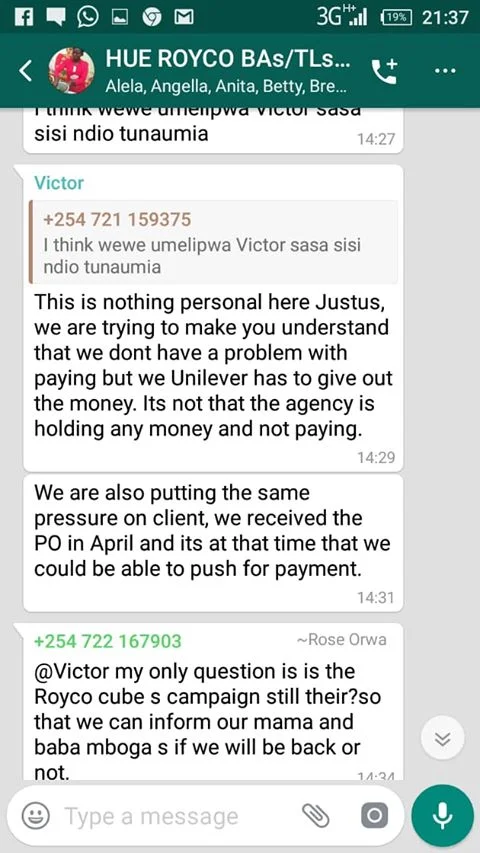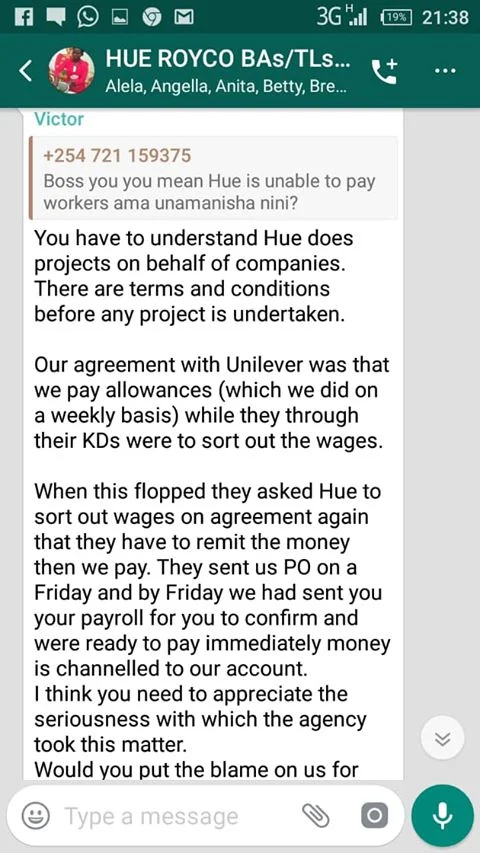 Hue Experiential Marketing Agency under Unilever Kenya why have you refused to pay your brand ambassadors money after doing Royco Mama Mboga campaign 2019 field job for you? We have tried begging, reasoning out, calling, invoking the name of God, all in vain.