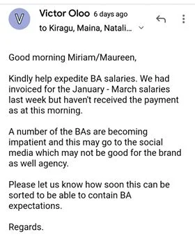 A group of distressed ladies has reached out to nyakundireport.com to express their great disappointment at how a Kenyan marketing agency “Hue Experiential” in conjunction with Unilever Kenya has failed to remit their salaries despite having completed a four-month job as brand ambassadors.
