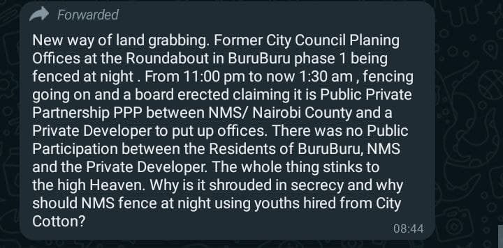 The incident was a surprise to many locals since there is no documented record of any Public Participation between Residents of BuruBuru, NMS and the rogue private Developer.