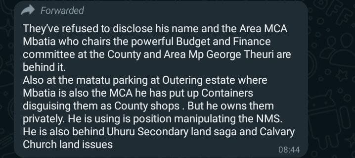 Apart from running errands for his MP, Mbatia is said to be plotting his own mischievous moves like a recent attempt to grab the Matatu Parking at Outering Estate by setting up private containers disguised as county government shops.
