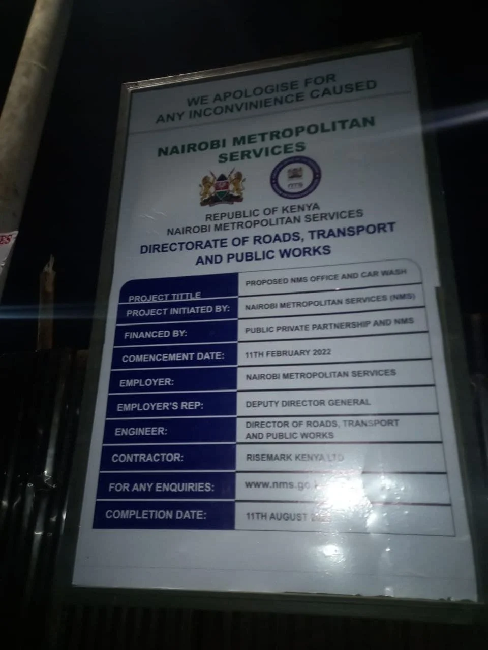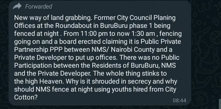 An eyewitness who anonymously spoke to this site’s Chief Editor disclosed that between the hours of 11 pm and 1:30 am last night, suspicious activity was spotted at the former Nairobi City Council planning offices near the Phase 1 roundabout.