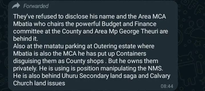 Apart from running errands for his MP, Mbatia is said to be plotting his own mischievous moves like a recent attempt to grab the Matatu Parking at Outering Estate by setting up private containers disguised as county government shops.