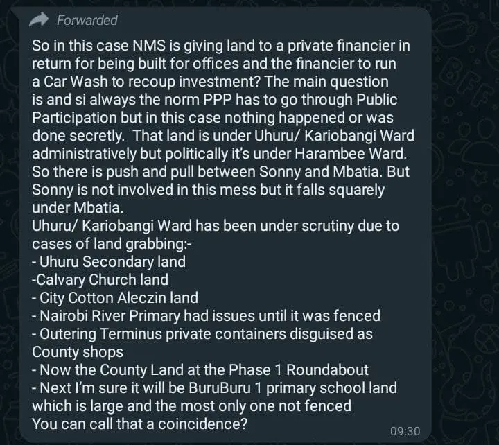 Through his position in the NMS, Mbatia is also reported to be behind the land sagas at Uhuru Secondary and Cavary Church in Buruburu.