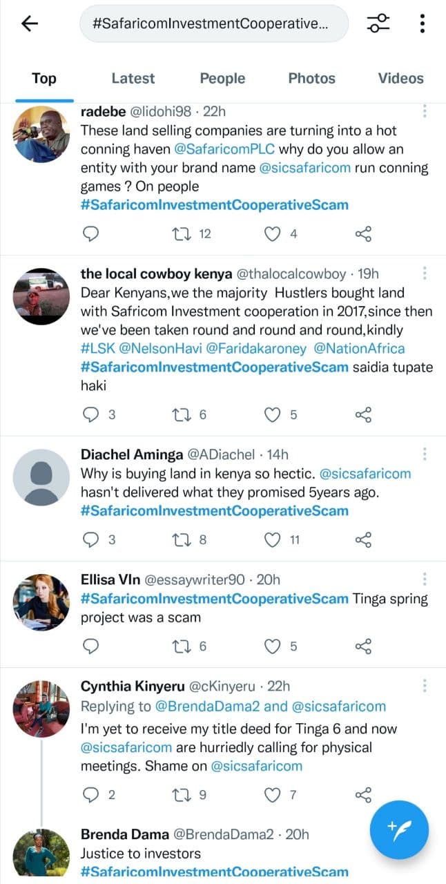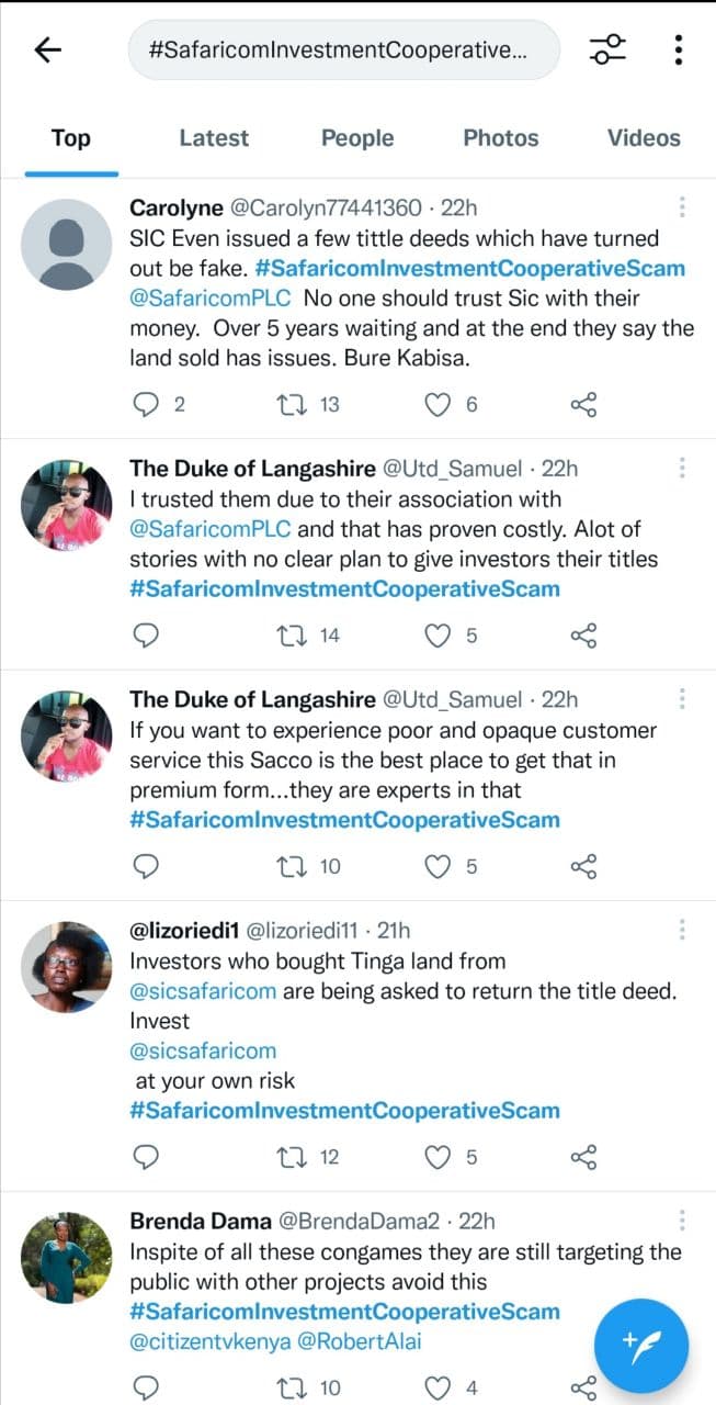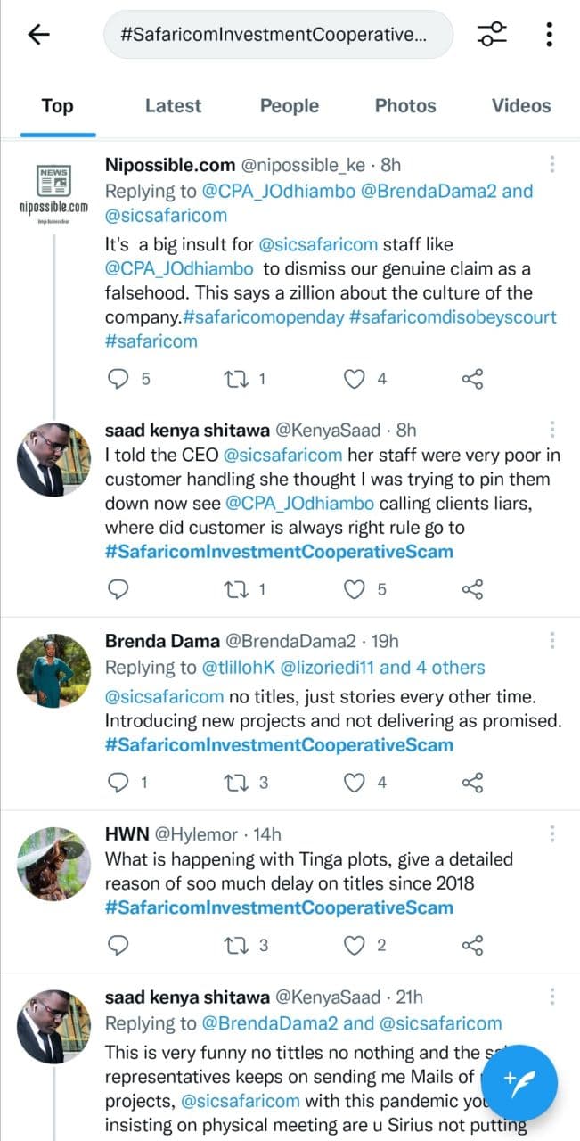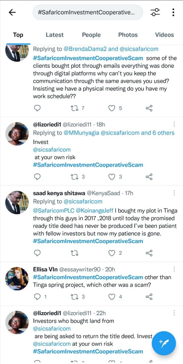 Safaricom Investment Co-operative (SIC) has been accused of duping clients. Clients who invested in the cooperative in 2017 are yet to receive their title deeds that were supposed to cover the building of Tinga Springs plots. “If you are planning to invest in a plot kindly don’t try Sic they are big liars. 2 years do