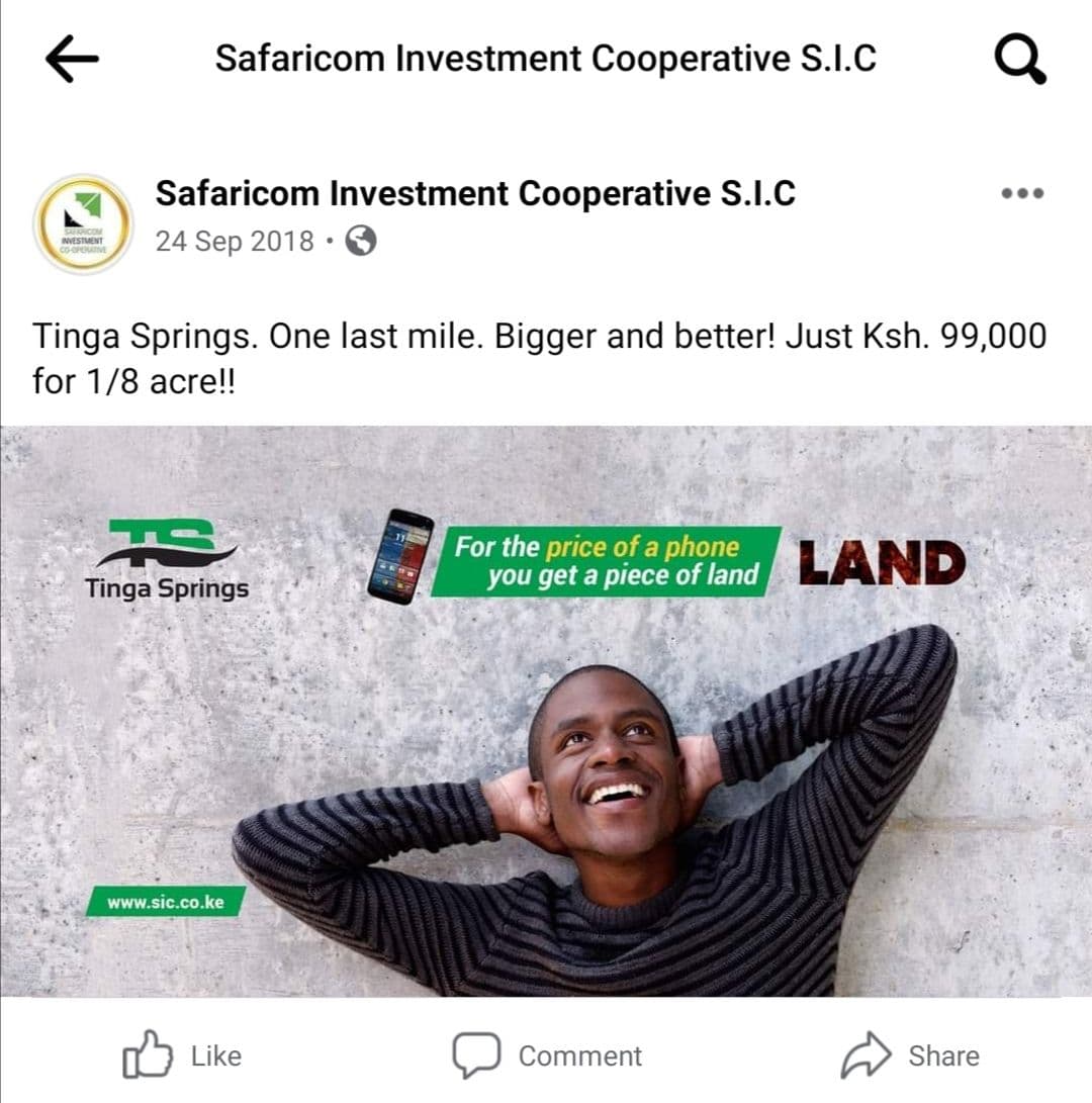 An advert by Safaricom Investment Co-operative calling on investors to take up plots at Tinga Springs in 2018. More than 3 years later, clients have not been issues with their title deeds. The management has also gone mute.
