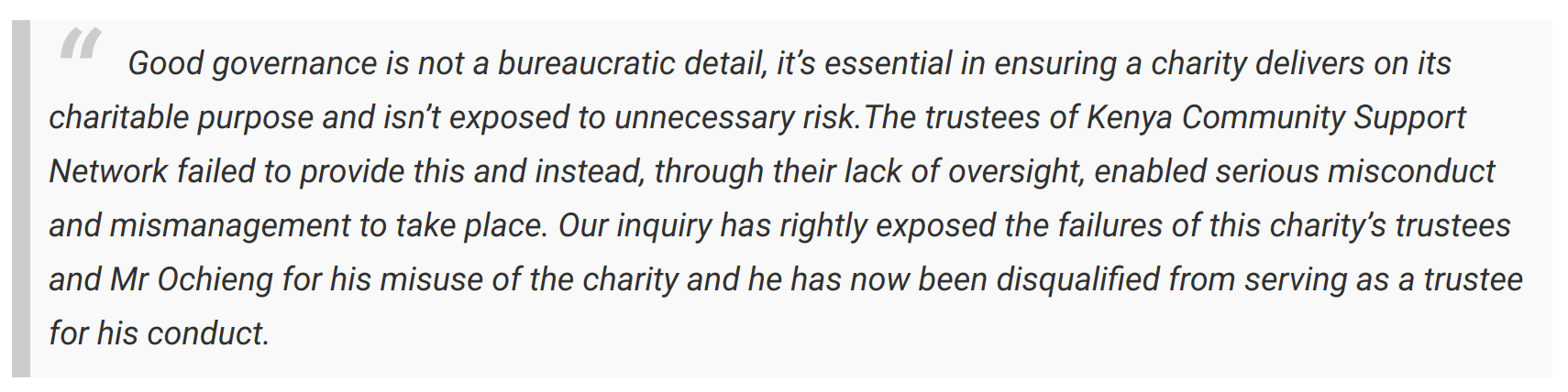 CAPTION: A quote by Tim Hopkins, Assistant Director of Investigations and Inquiries at the UK's Charity Commission which was probing Mr Ochieng's foundation
