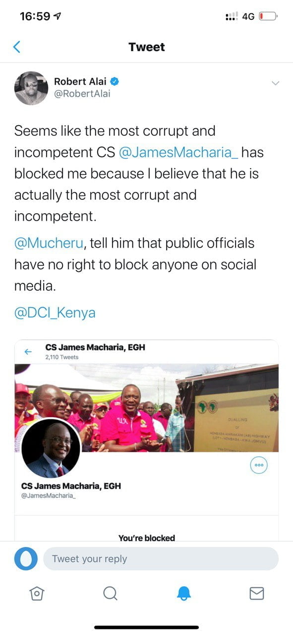 In a response shortly after, Alai rightfully reminded Macharia through ICT Minister Joe Mucheru that public officials are completely out of order when they block citizens – whom they are answerable to – on social media.