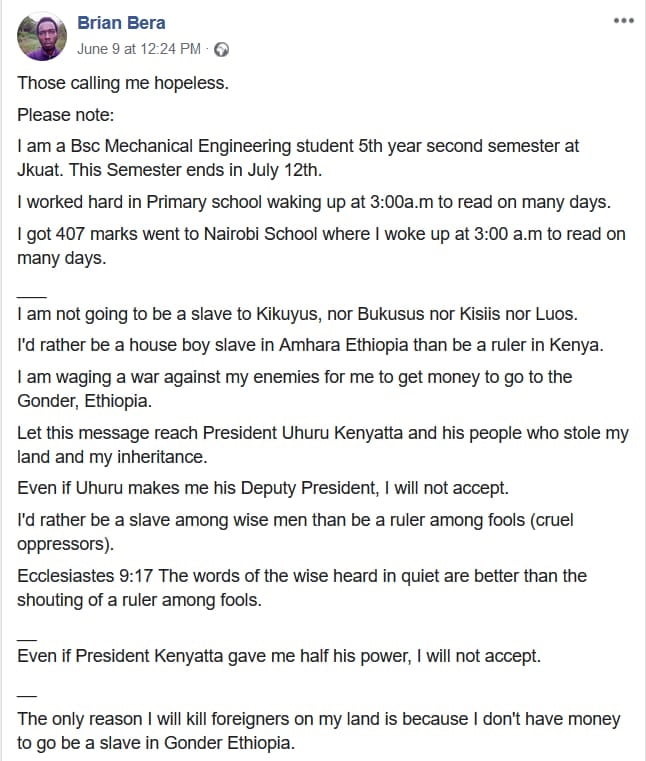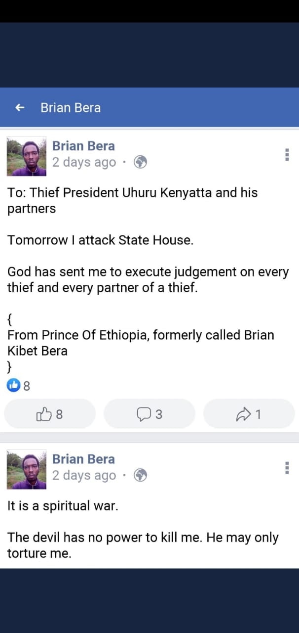 Brian Kibet Bera, a 25-year-old Jomo Kenyatta University of Agriculture and Technology (JKUAT) student was yesterday arrested at State House, Nairobi, for trespass.
