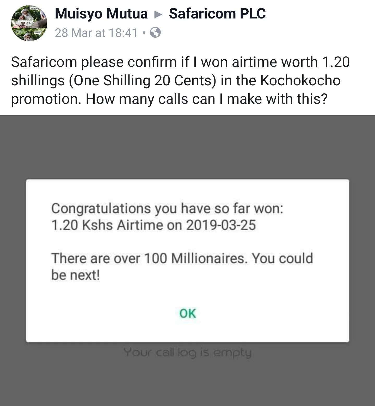 Rose isn’t the only customer who has been “handsomely” rewarded by Safaricom. When going through Facebook, we came across another customer who received Ksh. 1.20 as an award in the same promotion.