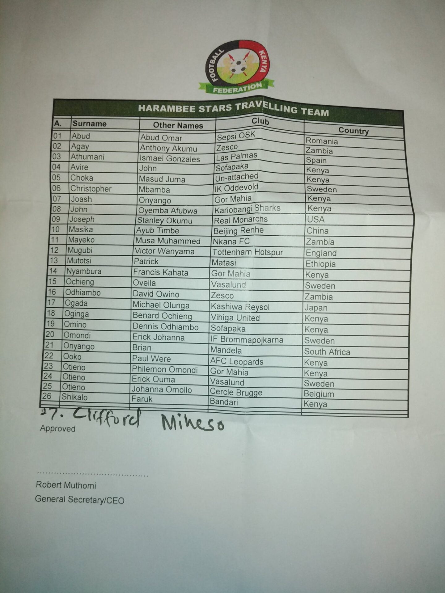 There was, however, a huge public uproar over a few missing names on the list, including this season's Kenya Premier League's top scorer Allan Wanga who scored 18 goals for Kakamega Homeboyz.