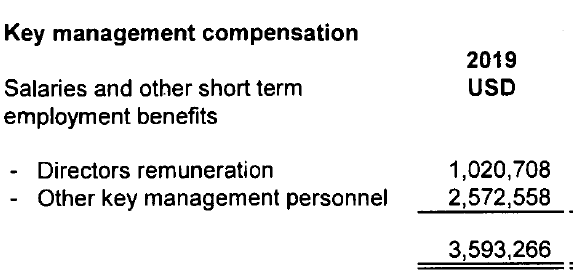 M-Kopa reports over 1000 staff; but statements reveal over half over half of the payroll US$ 3,593,266 is paid to these 25 “Directors and other Key Management” [extract from page 54 of financial statements] which is more than all the African staff members combined. These 25 directors and managers average a pay of KSh. 1,317,530 per month. Kenyan staff are paid 34,000 per month (US$ 312) according to Blacklock’s.