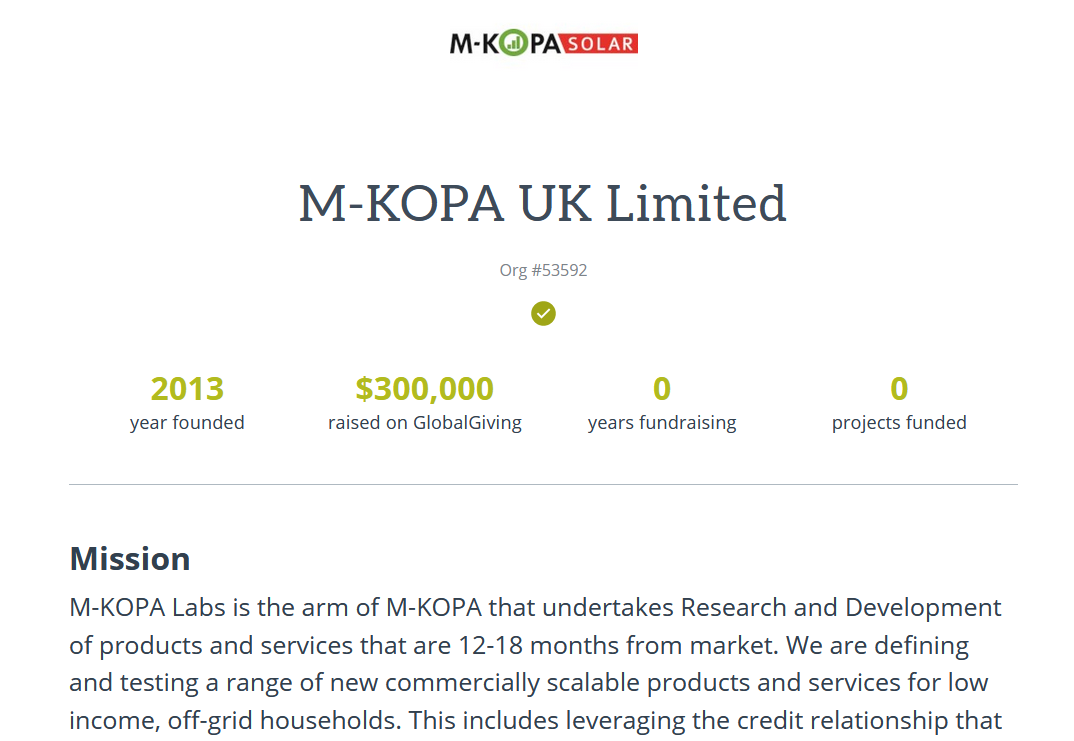 M-Kopa has since removed the “Donate to M-Kopa” posting from the Global Giving website after receiving questions from journalists.