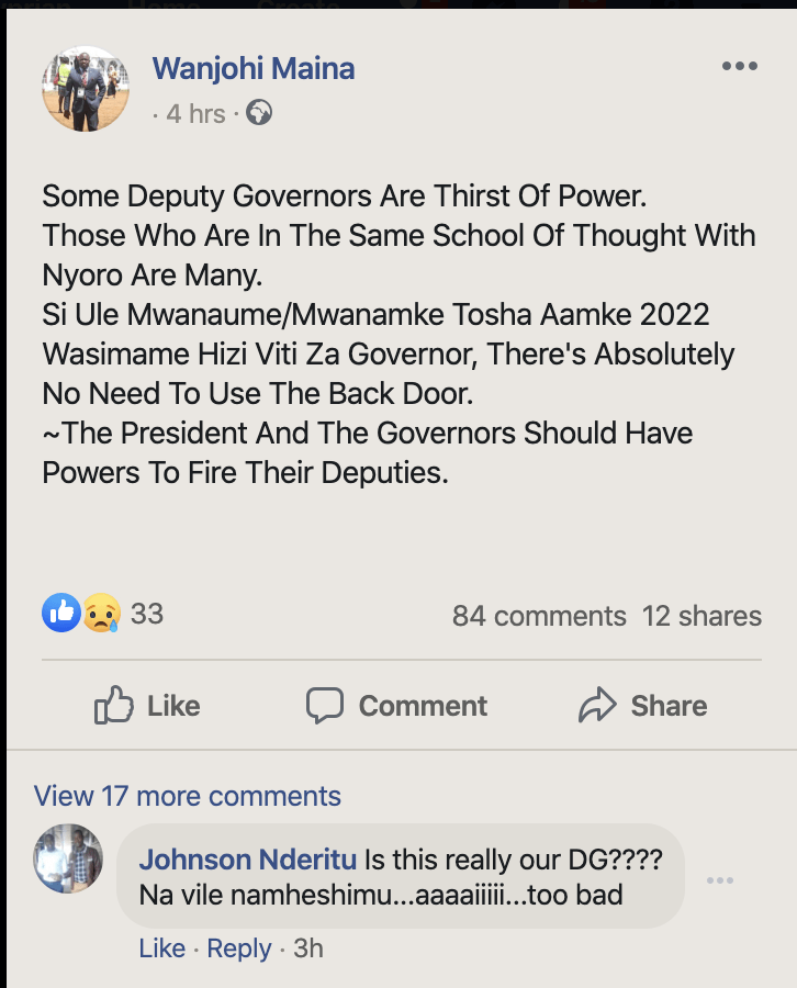 Devolution is under threat, constant threat. Kiambu Governor Ferdinand Waititu was impeached through the rogue hands of the Deputy Governor. Similar plot is trying to Find it’s way right at the county Government of Nyeri. @NyeriYetu @GovLeeKinyanjui #NyeriDGIsAntiDevolution pic.twitter.com/KFAscKwNIs