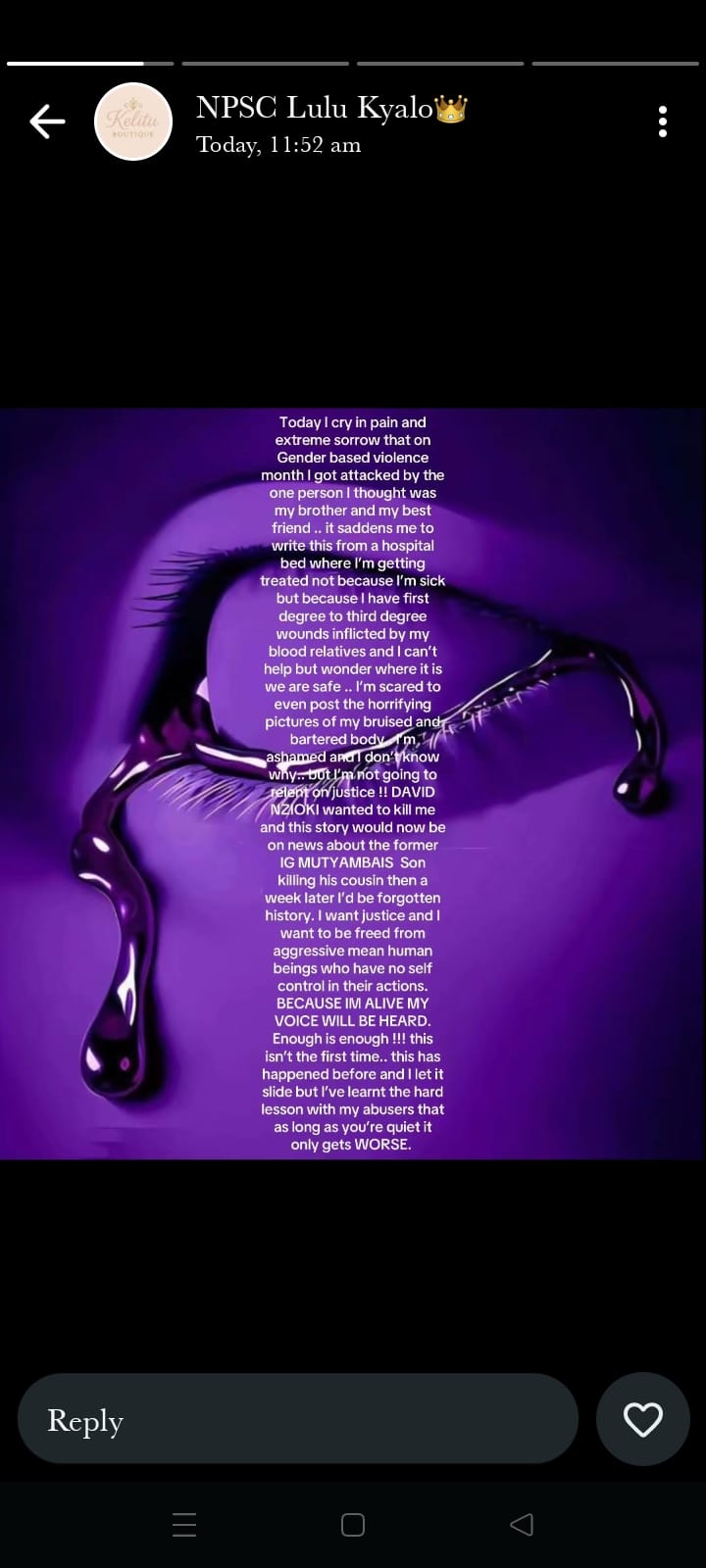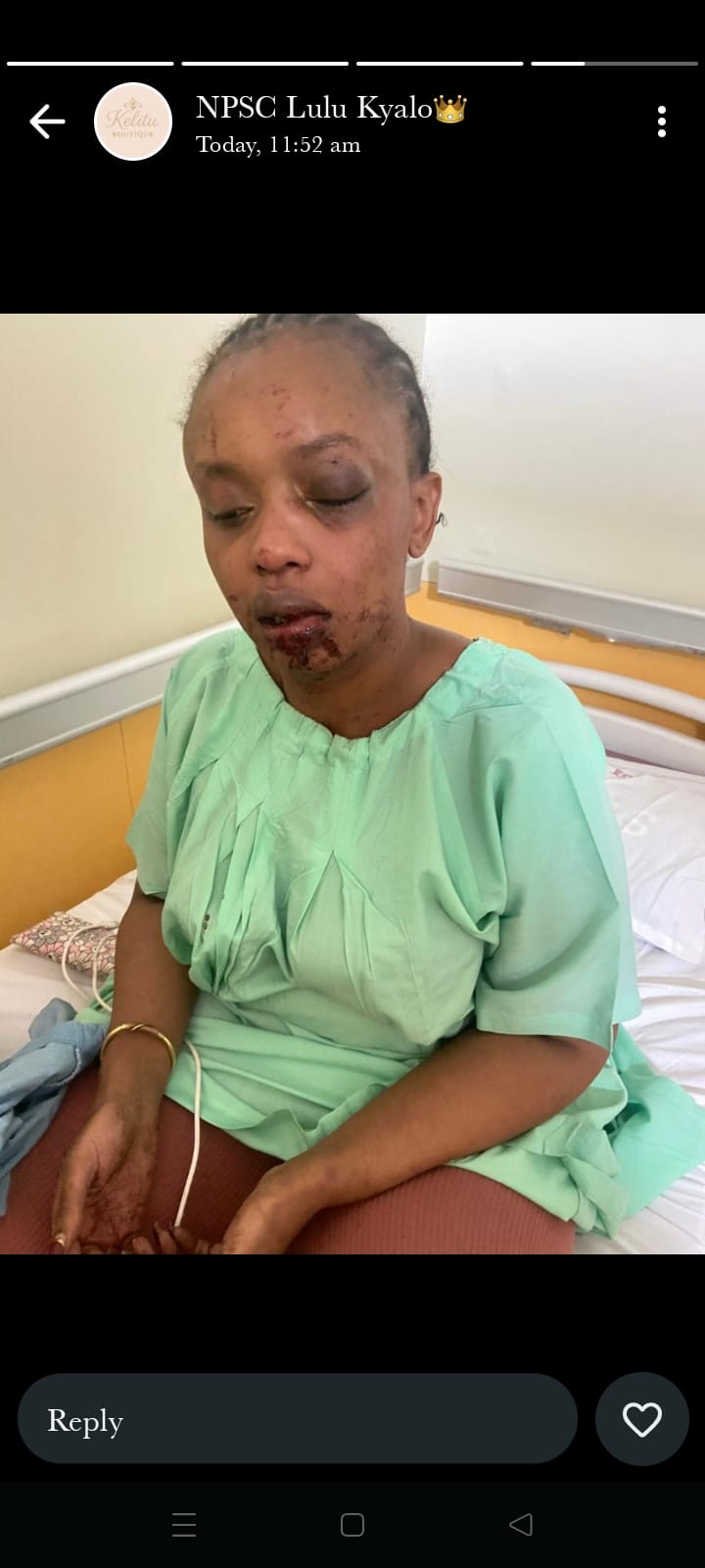 “Today I cry in pain and extreme sorrow that, on Gender-Based Violence Month. I got attacked by the one person I thought was my brother and my best friend. It saddens me to write this from a hospital bed where I’m getting treated, not because I’m sick, but because I have first-degree to third-degree wounds inflicted by my blood relatives, and I can’t help but wonder where it is we are safe. I’m scared to even post the horrifying pictures of my bruised and battered body, ashamed, and I don’t know why. But I’m not going to relent on justice! David Nzoki wanted to kill me and this story would now be on the news about the former IG Mutyambai’s son killing his cousin, then a week later, I’d be forgotten history. I want justice, and I want to be freed from aggressive, mean human beings who have no self-control in their actions. Because I’m alive, my voice will be heard. Enough is enough! This isn’t the first time. This has happened before, and I let it slide, but I’ve learned the hard lesson with my abusers that as long as you’re quiet, it only gets worse,” she wrote in a WhatsApp status from her hospital bed.