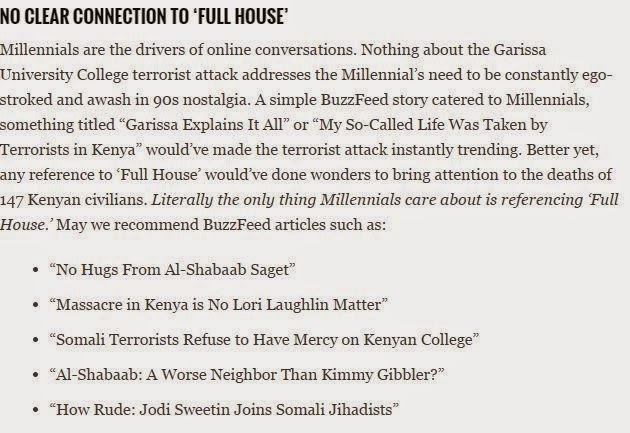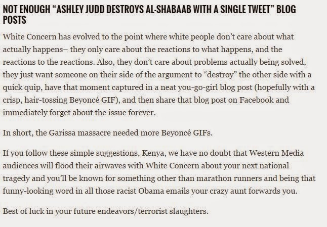 Thank you very much for your latest submission, entitled “Garissa University Terrorist Attack.” While it was gripping, heartfelt and original, it unfortunately fails to meet the strict criteria necessary to qualify for White Concern, which disqualifies you from any and all Western Media Coverage.