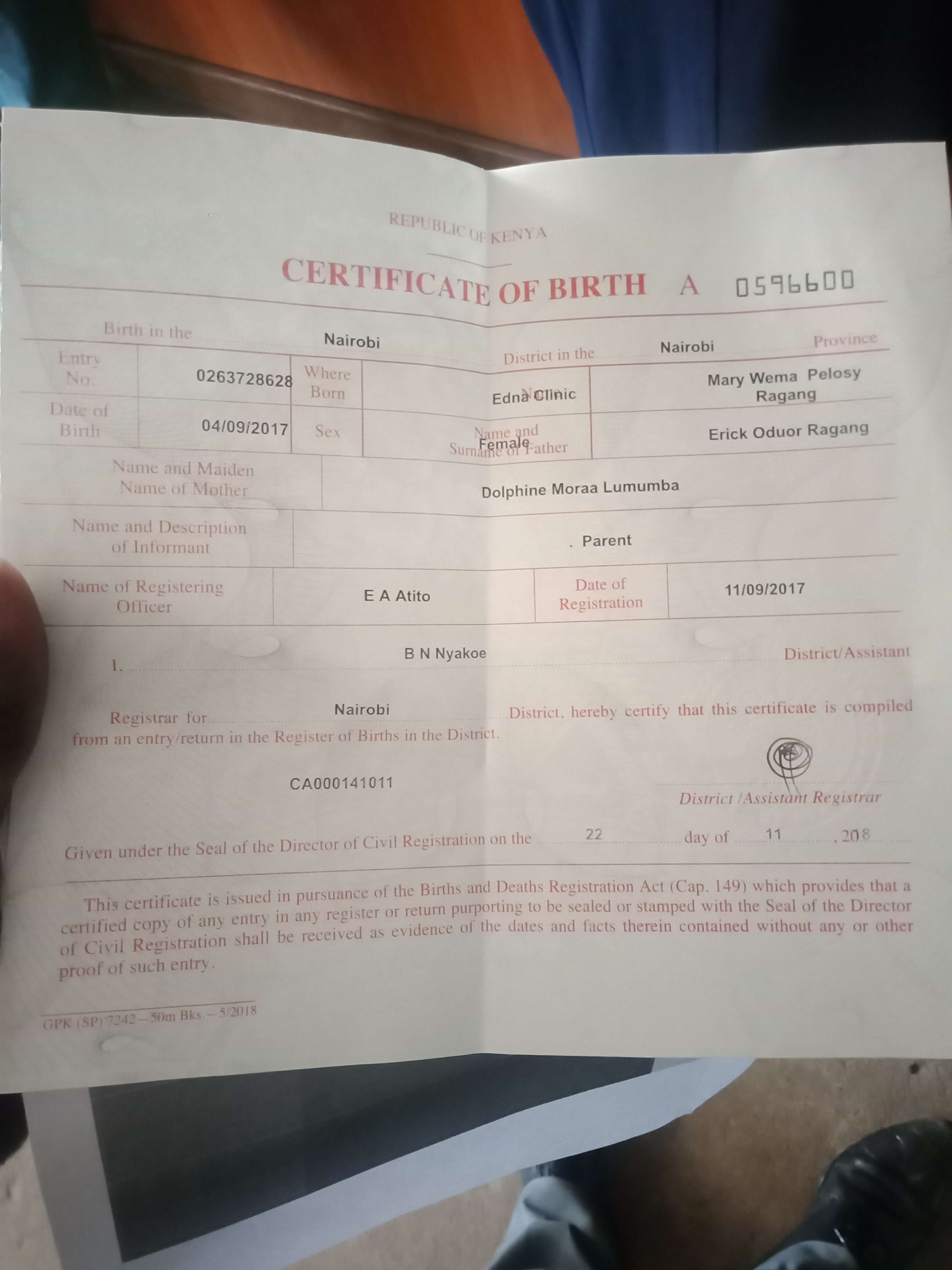 While still there, I noticed that the mother's name was totally different. My wife's name is Susan Achieng Odhiambo while the name on the birth certificate was Dolphine Moraa Lumumba.