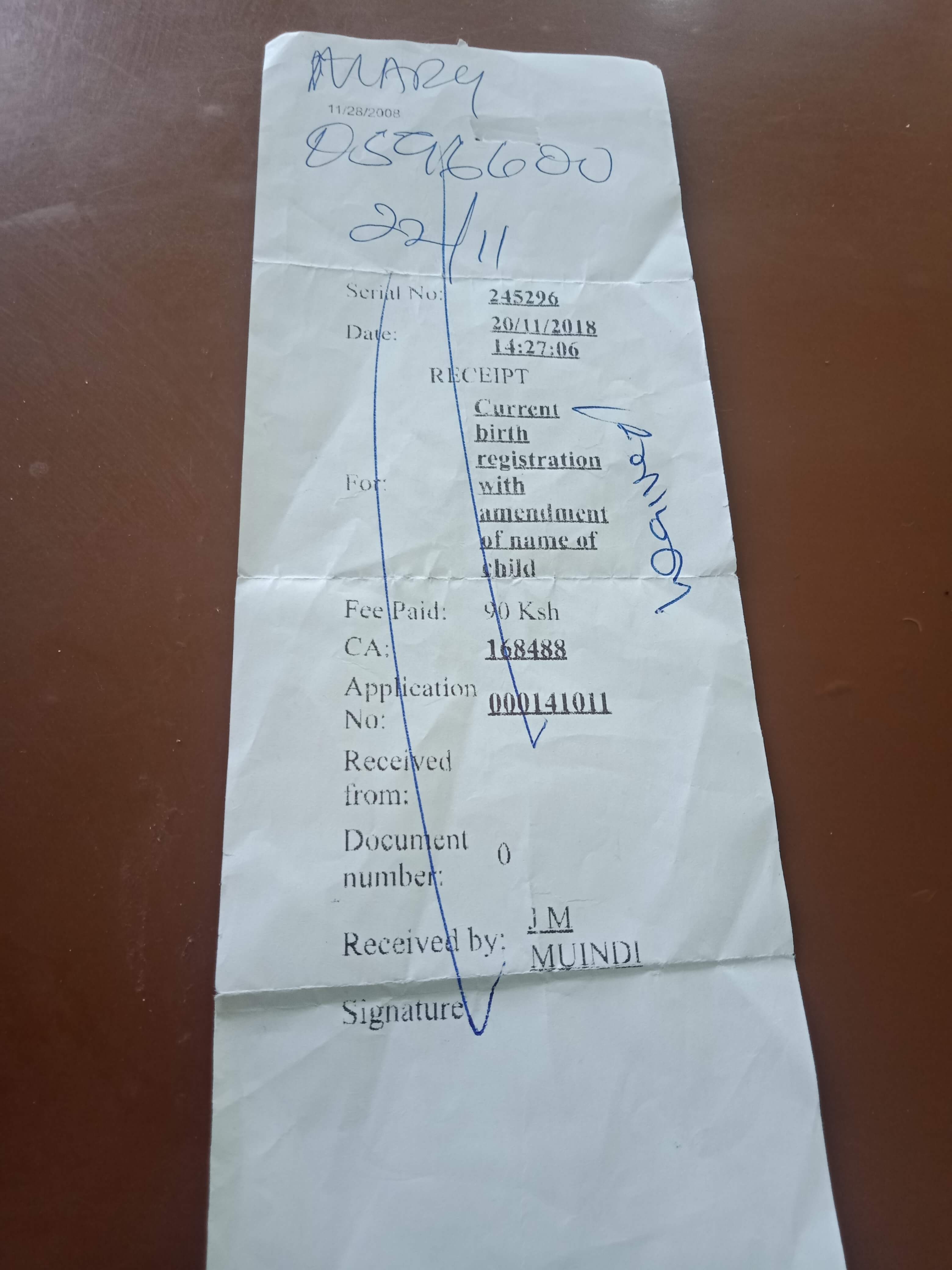 After rejecting her narrative of why I should pay a second time, she went to counter 5 and after some conversations with the guy at counter 5 came back and asked me do pay Sh. 40. I refused to pay that amount also given that they are the ones who did wrong entries on my daughter's birth certificate.
