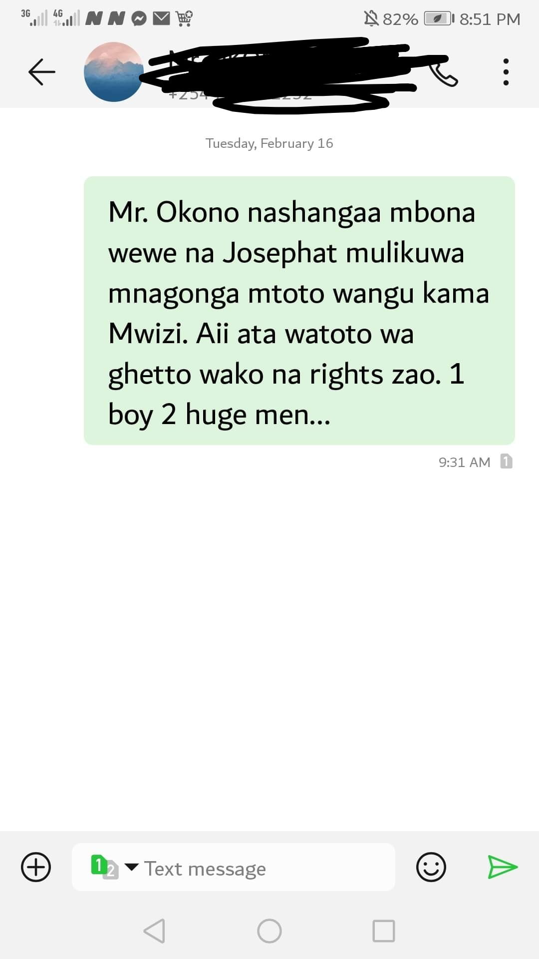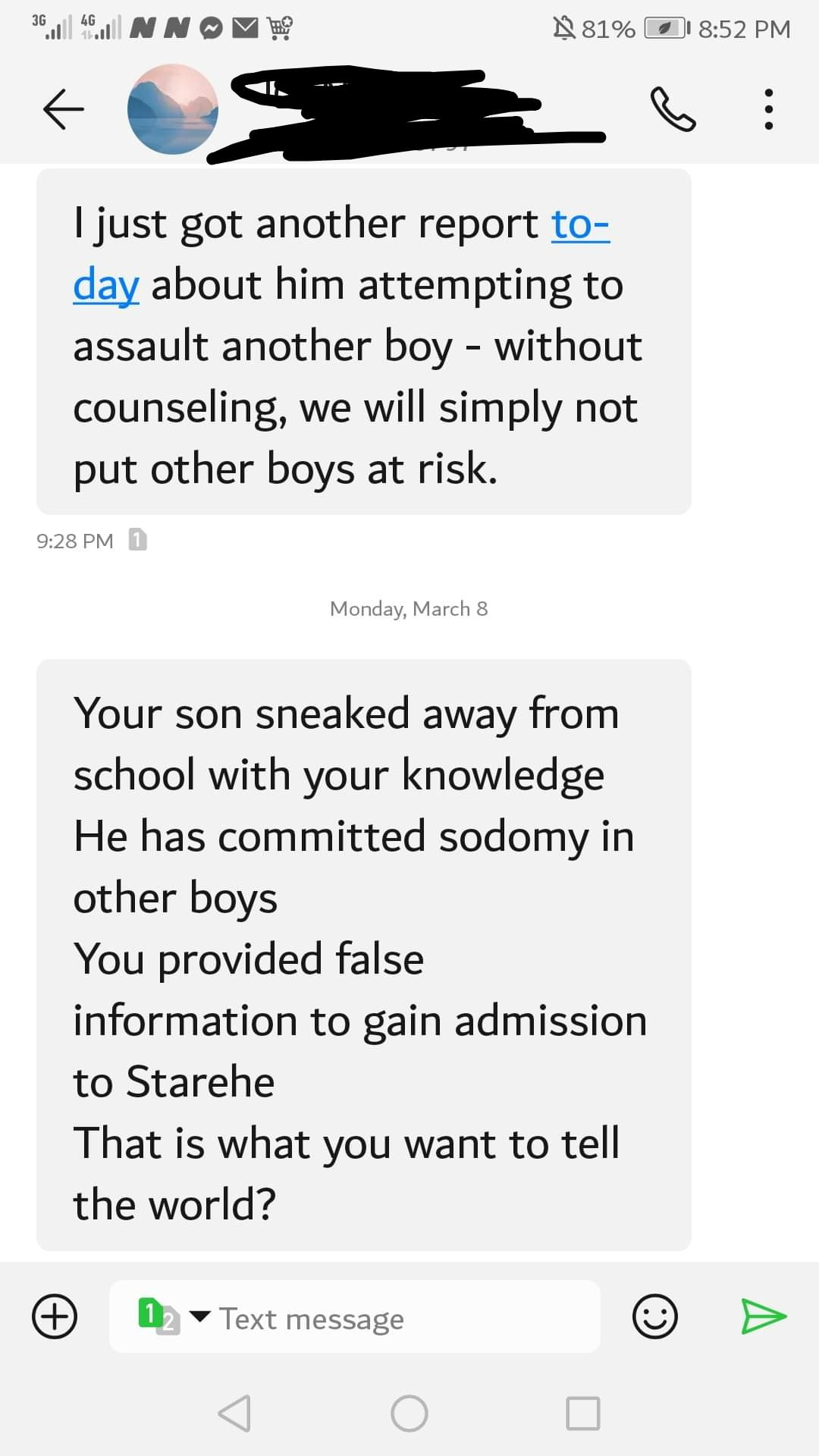 Please help my boy Nyakundi. Right now the school director keeps on threatening me through text messages. Here are the screen shots