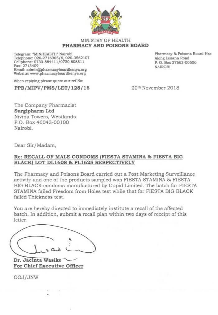 In a statement issued, the ministry says the pharmacy and poisons board carried out a post-marketing surveillance on one of the products sampled was FIESTA STAMINA and FIESTA BIG BLACK condoms manufactured by Cupid limited.